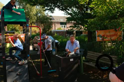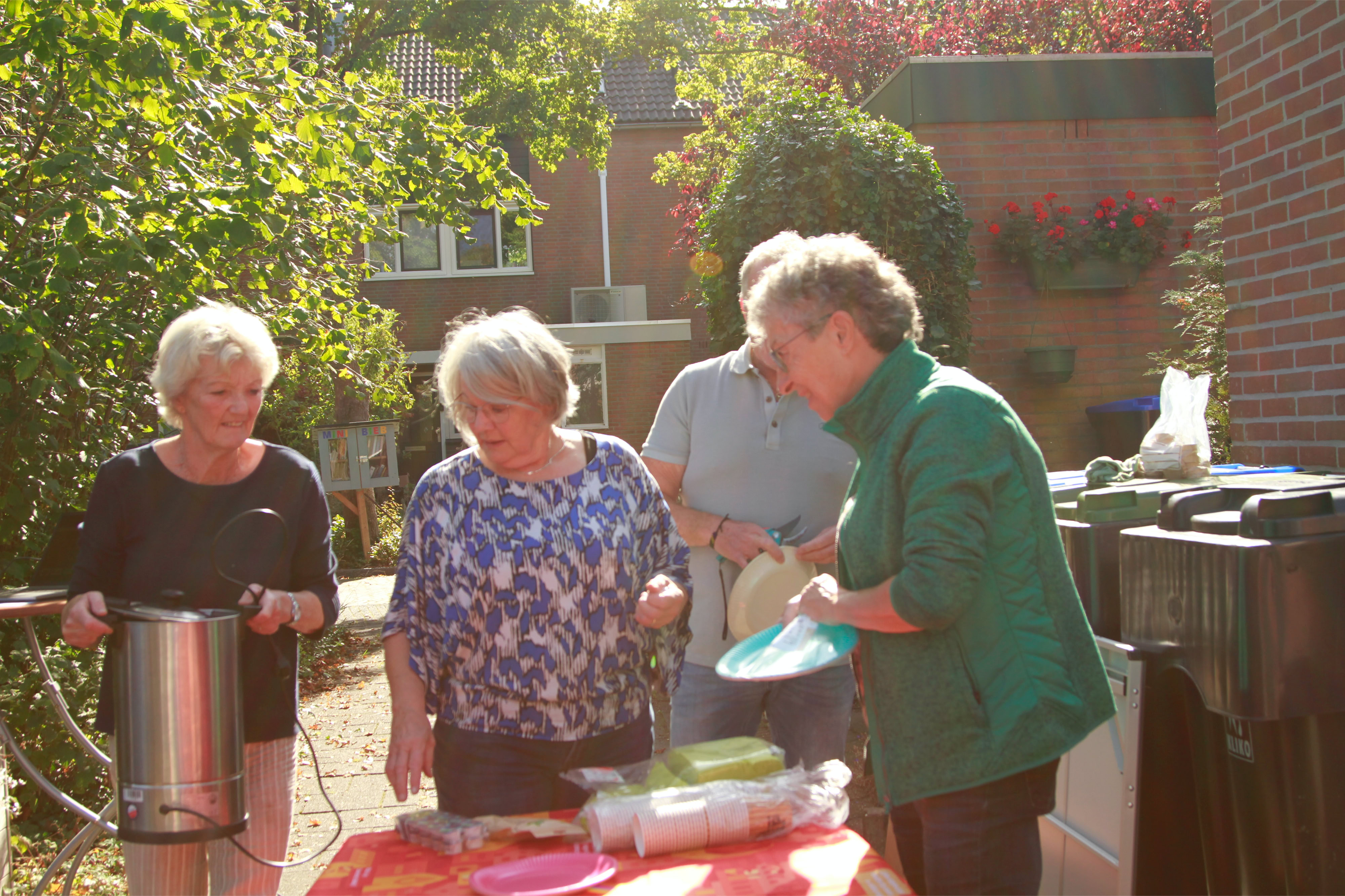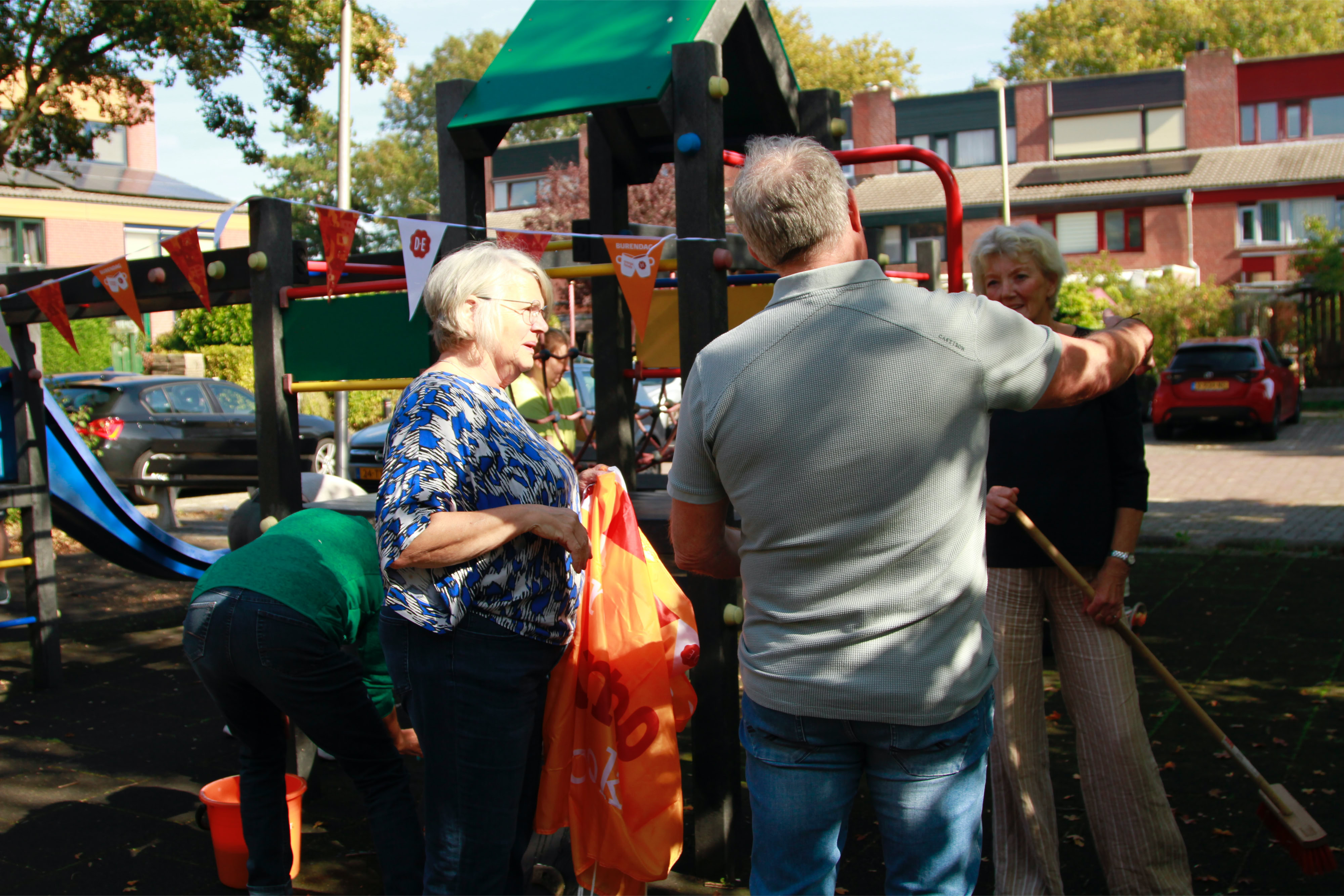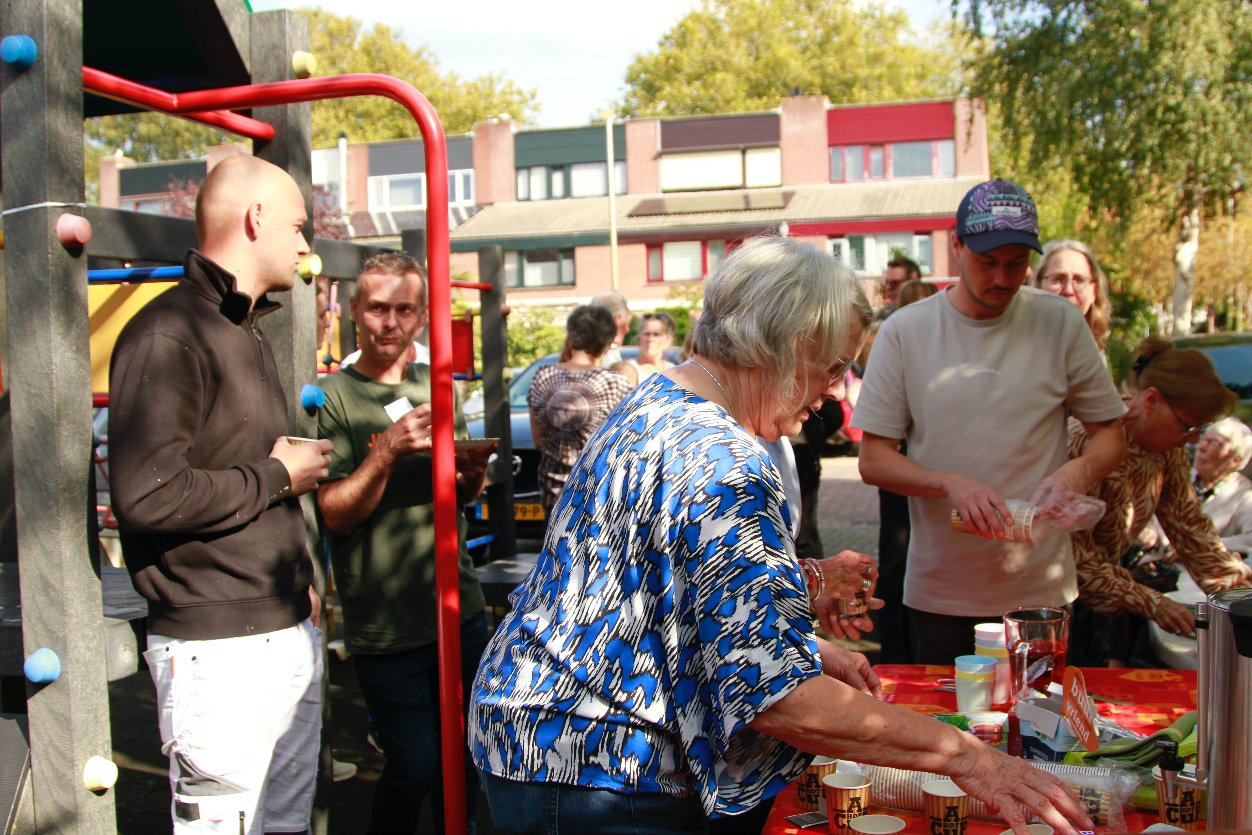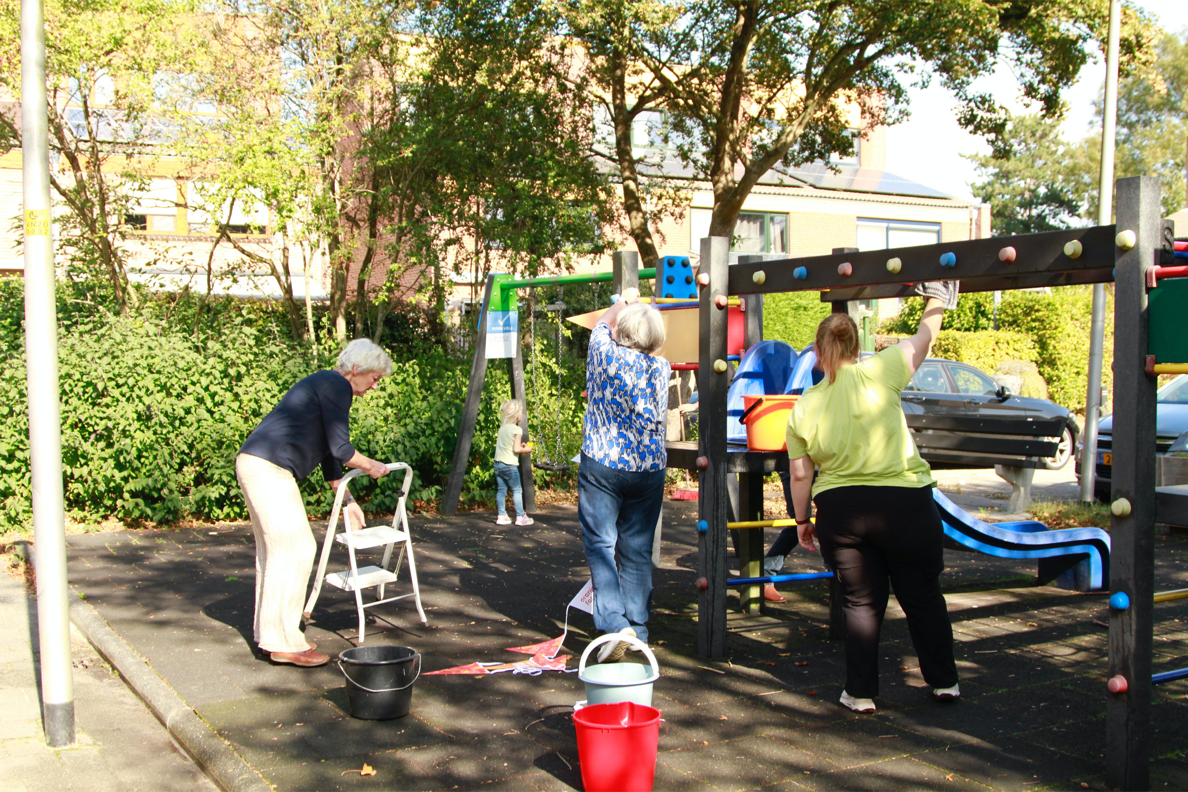 De buurtjes begonnen met het schoonmaken van de speeltuin. Dat gebeurde op een grondige wijze, zelfs de speeltoestellen en de bankjes waar men op kan zitten werden grondig gereinigd en gesopt, de tegels werden schoongemaakt en de eerste herfstbladeren opgeveegd. Ook de kinderen hielpen mee. Daarna was er tijd voor koffie, thee, heerlijke cakes en versnaperingen. Onder een lekkere zonnetje werd er ontspannen geconverseerd, gelachen en anekdotes verteld. Weer een fijn initiatief van de buurtvereniging, waarvoor bedankt!